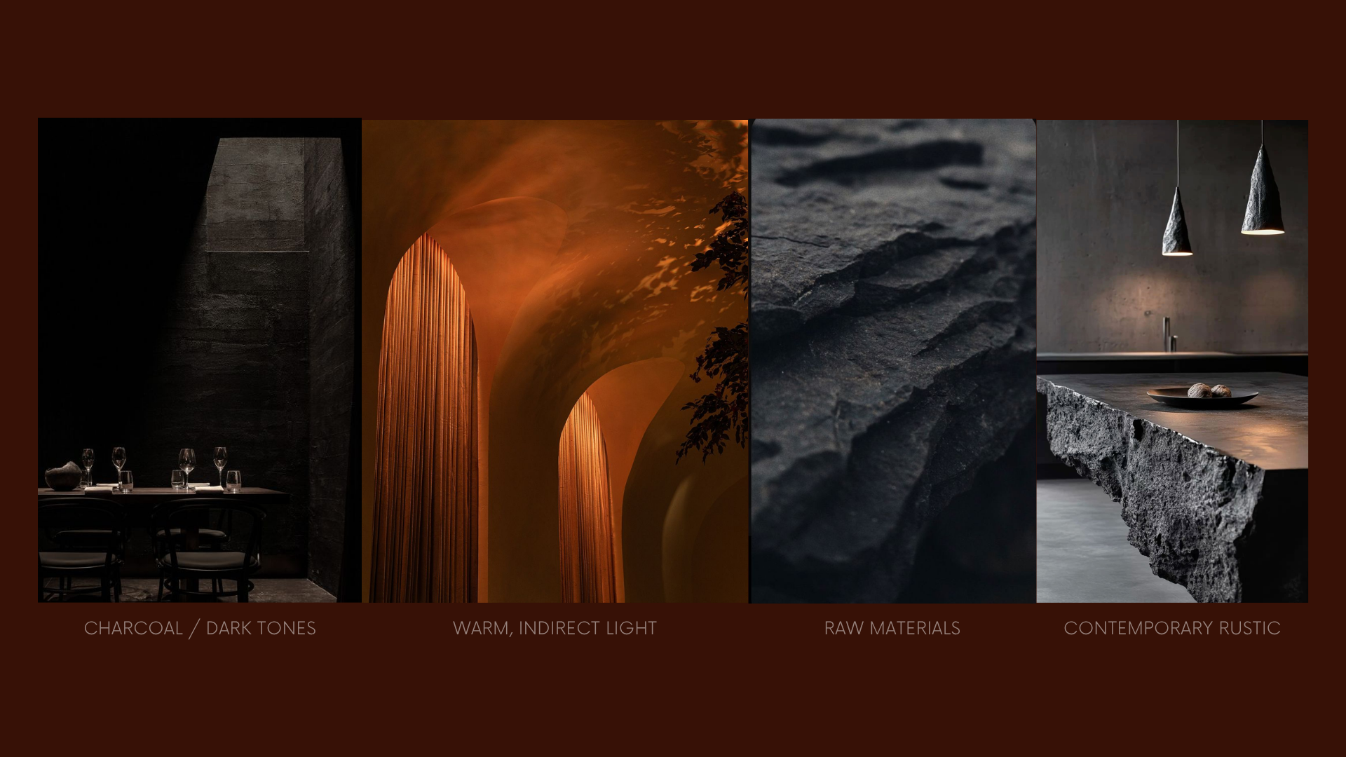 The atmosphere is intended to feel dark, calm and grounded, with low lighting allowing smoke, ember and open flame to shape the experience.