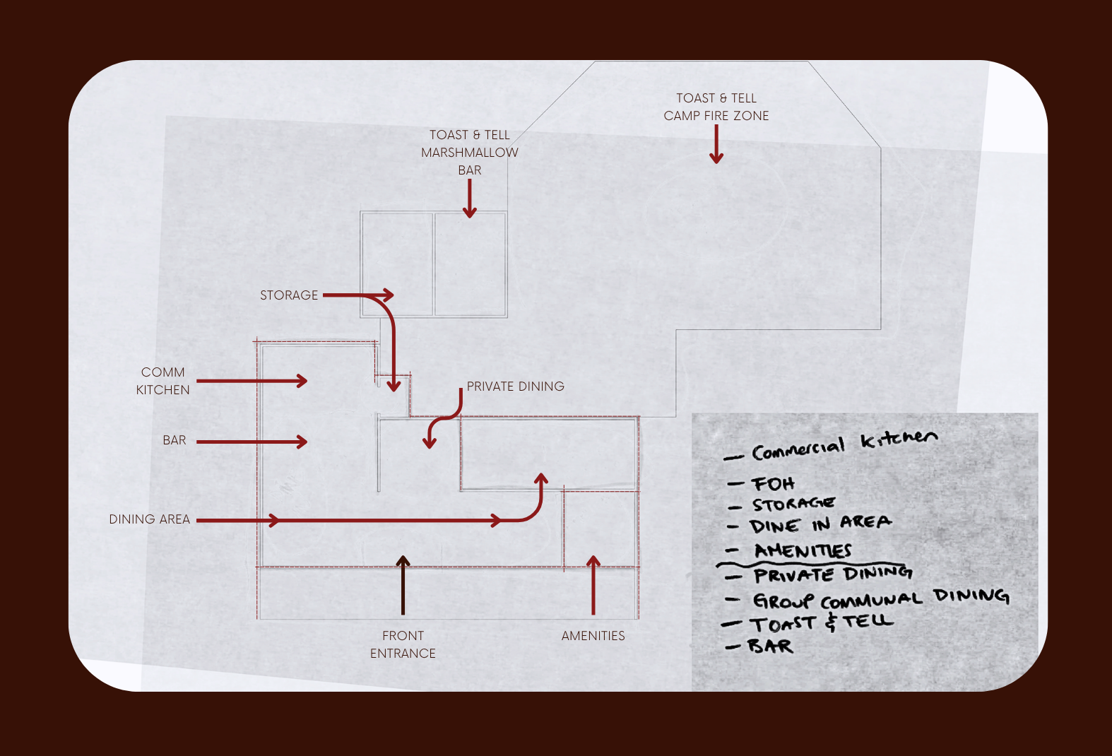 Functionally, it should create an immersive dining environment where fire remains the central focus.