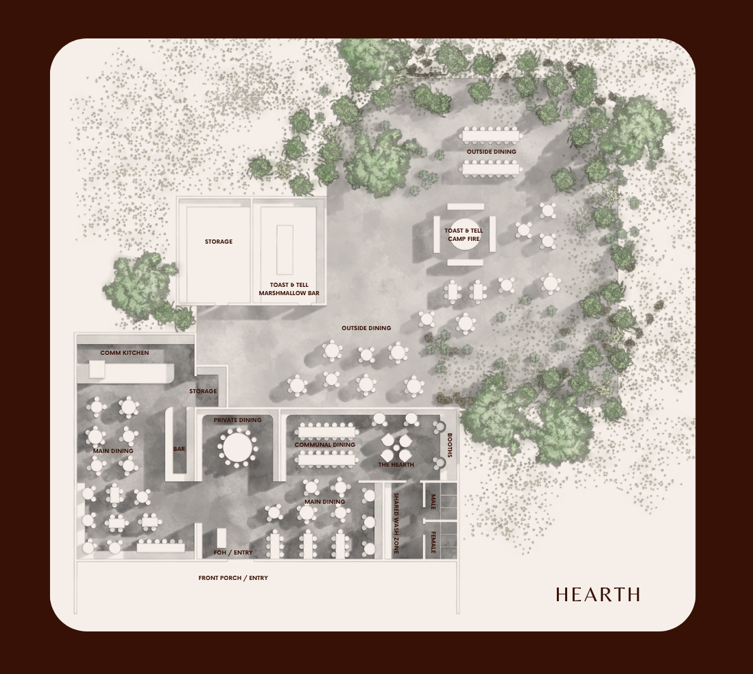 Hearth is a fire-led restaurant designed as a place to gather, cook, toast and talk around open flame. The space should support dining, food preparation and service in a way that feels cohesive with the historic shell and material palette.
